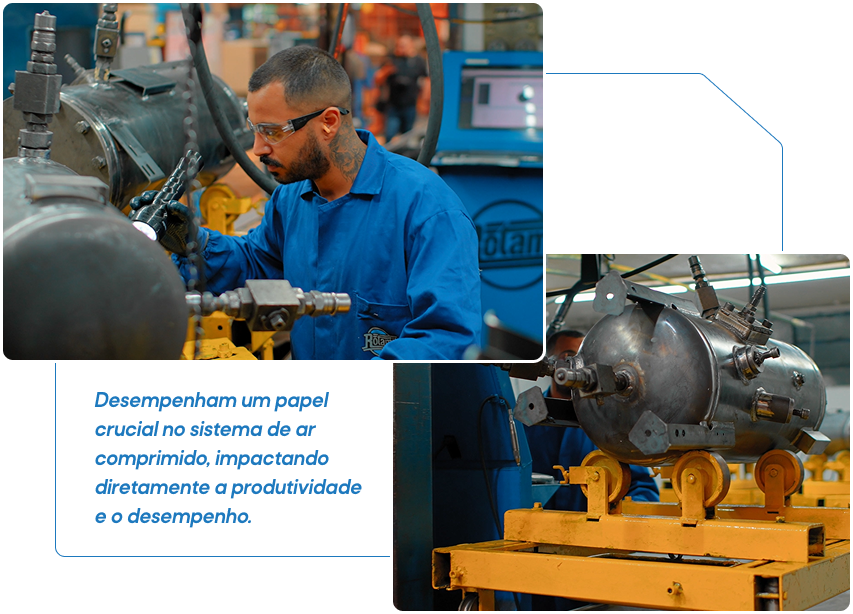 Esses reservatórios desempenham um papel crucial no sistema de ar comprimido, impactando diretamente a produtividade e o desempenho do compressor. São responsáveis por suprir o sistema durante picos momentâneos de consumo e estabilizar a pressão em toda a rede, evitando oscilações que possam comprometer a operação de máquinas e ferramentas.